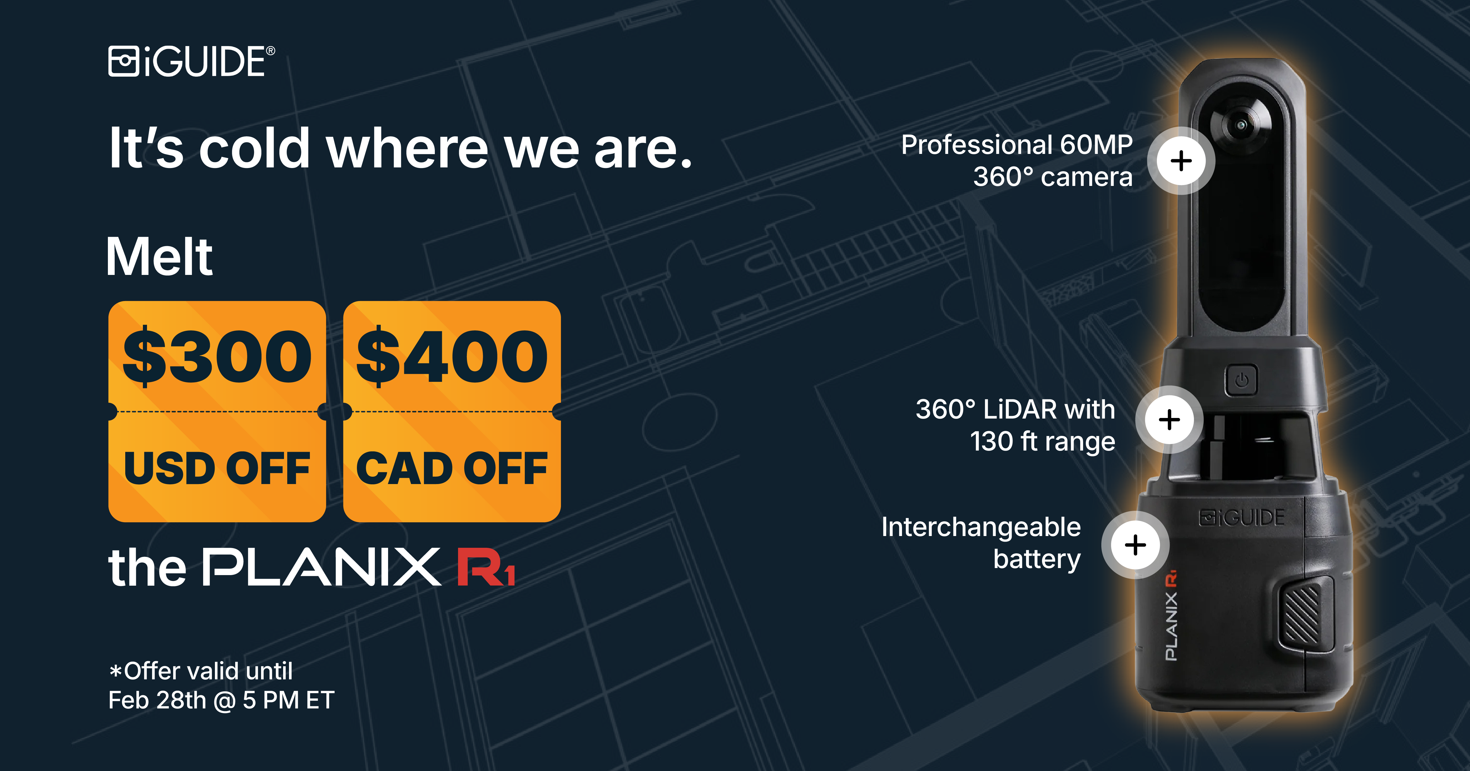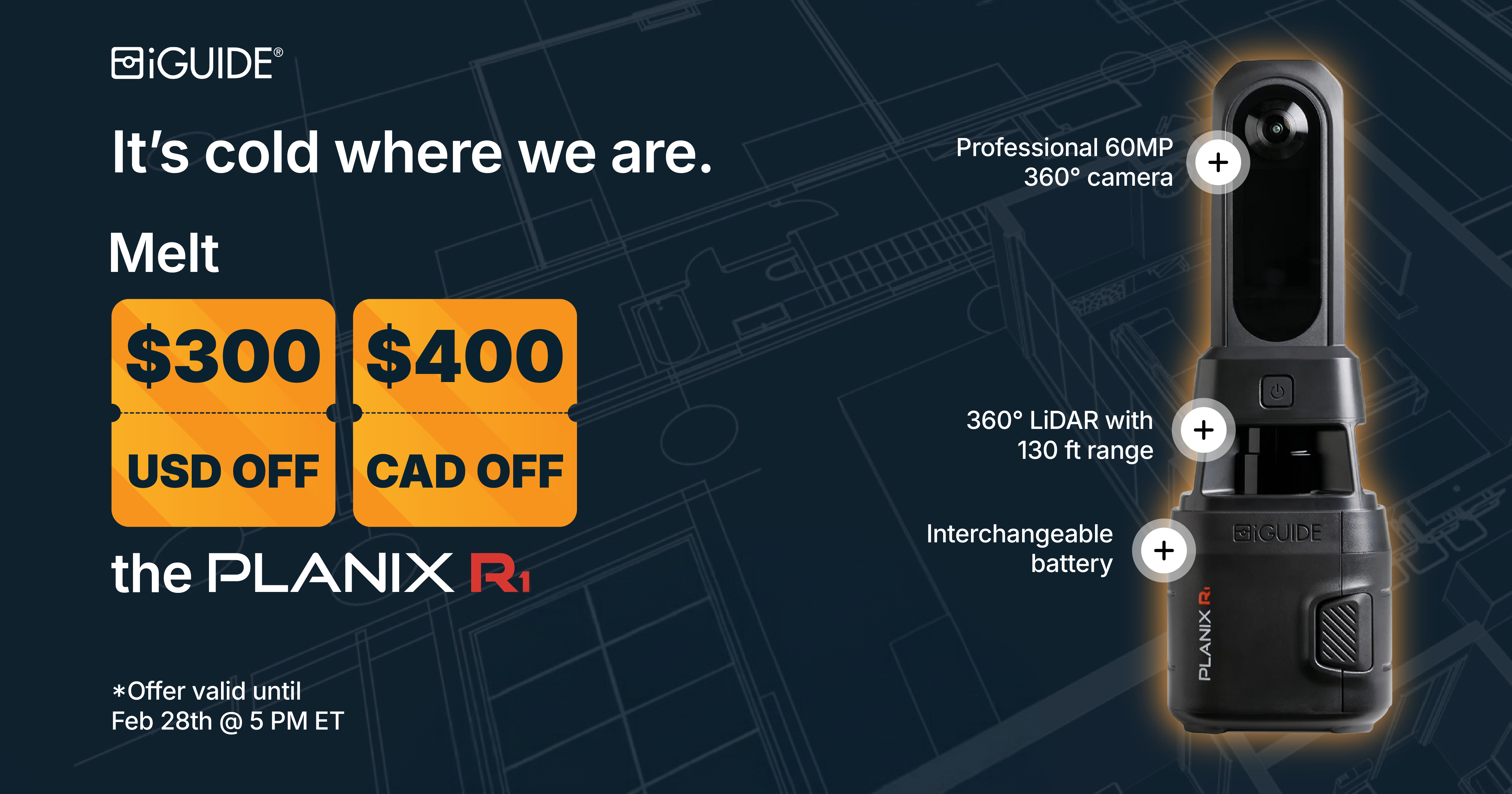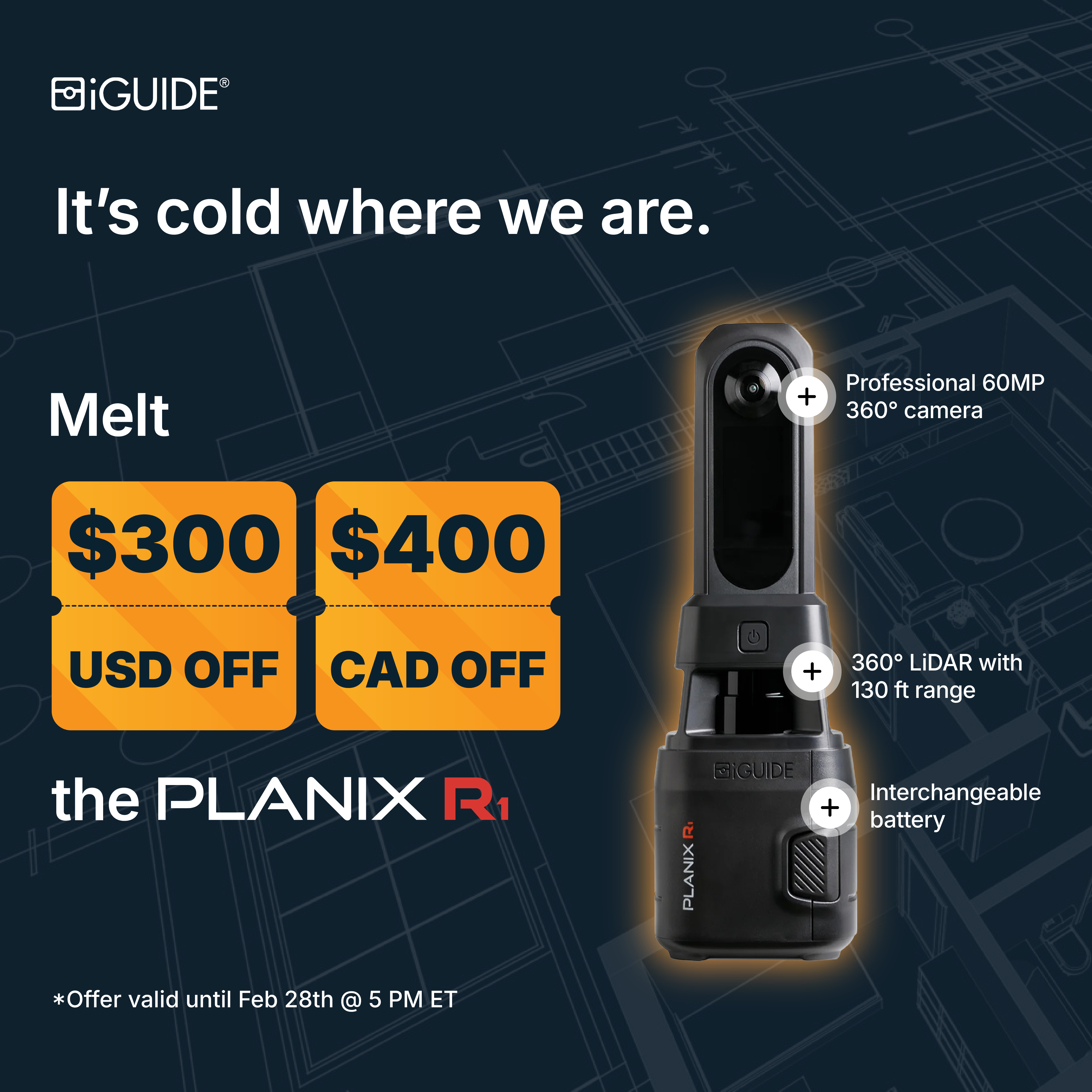 The iGUIDE PLANIX camera system is a 360° time-of-flight lidar scanner with accuracy exceeding industry standards.